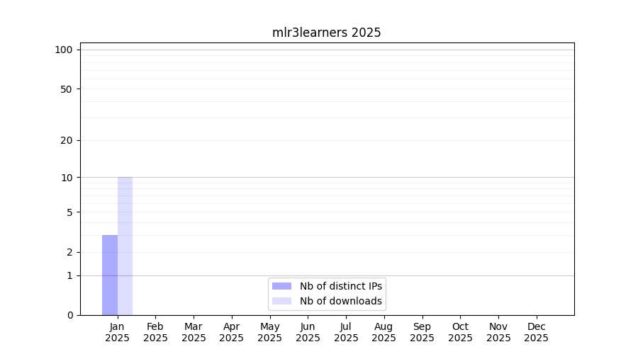 Number of downloads for experiment package mlr3learners, year by year, from 2025 back to 2014 (years with no downloads are omitted):
