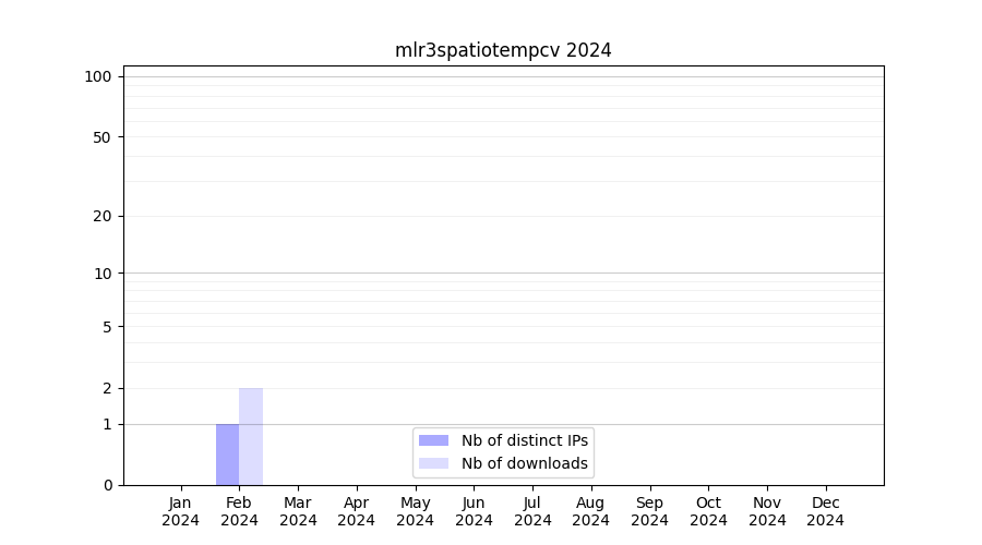 Number of downloads for experiment package mlr3spatiotempcv, year by year, from 2025 back to 2014 (years with no downloads are omitted):