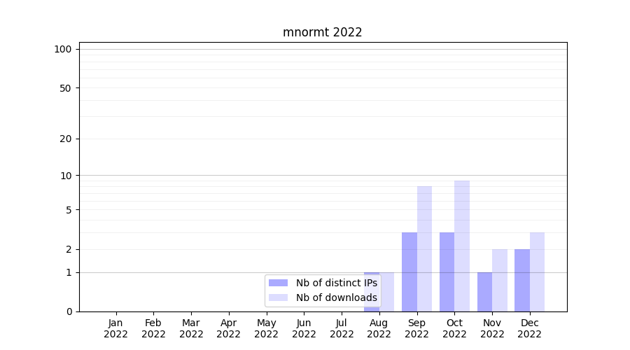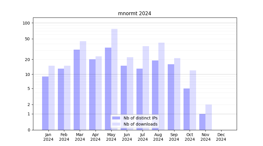 Number of downloads for experiment package mnormt, year by year, from 2025 back to 2014 (years with no downloads are omitted):