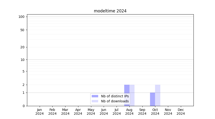 Number of downloads for experiment package modeltime, year by year, from 2025 back to 2014 (years with no downloads are omitted):