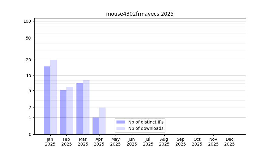 Number of downloads for experiment package mouse4302frmavecs, year by year, from 2025 back to 2014 (years with no downloads are omitted):