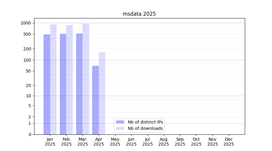 Number of downloads for experiment package msdata, year by year, from 2025 back to 2014 (years with no downloads are omitted):