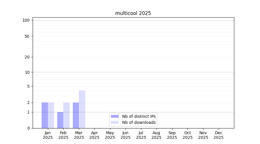 Number of downloads for experiment package multicool, year by year, from 2025 back to 2014 (years with no downloads are omitted):