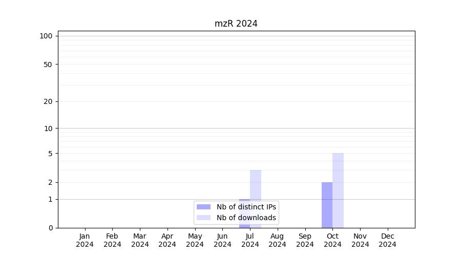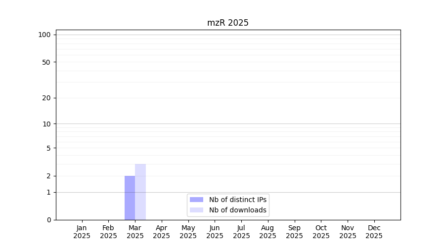 Number of downloads for experiment package mzR, year by year, from 2025 back to 2014 (years with no downloads are omitted):