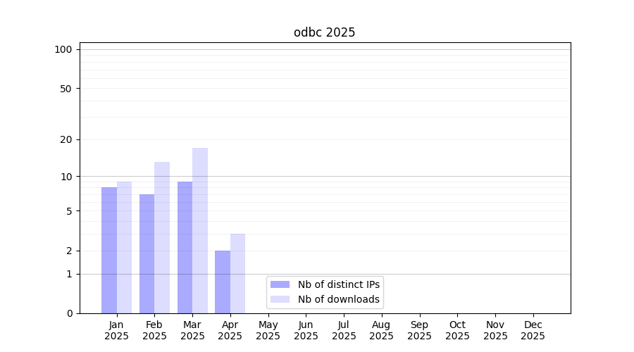 Number of downloads for experiment package odbc, year by year, from 2025 back to 2014 (years with no downloads are omitted):