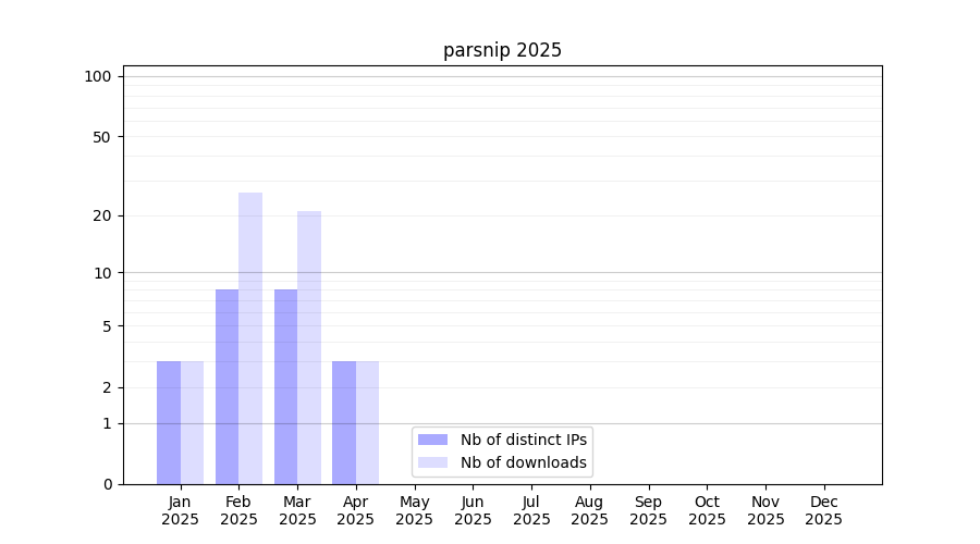 Number of downloads for experiment package parsnip, year by year, from 2025 back to 2014 (years with no downloads are omitted):