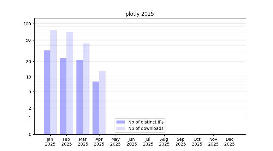 Number of downloads for experiment package plotly, year by year, from 2025 back to 2014 (years with no downloads are omitted):