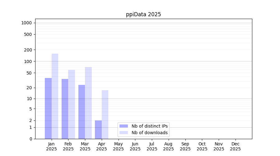 Number of downloads for experiment package ppiData, year by year, from 2025 back to 2014 (years with no downloads are omitted):