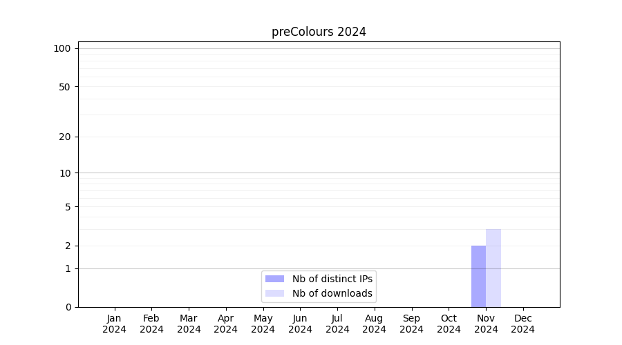 Number of downloads for experiment package preColours, year by year, from 2025 back to 2014 (years with no downloads are omitted):