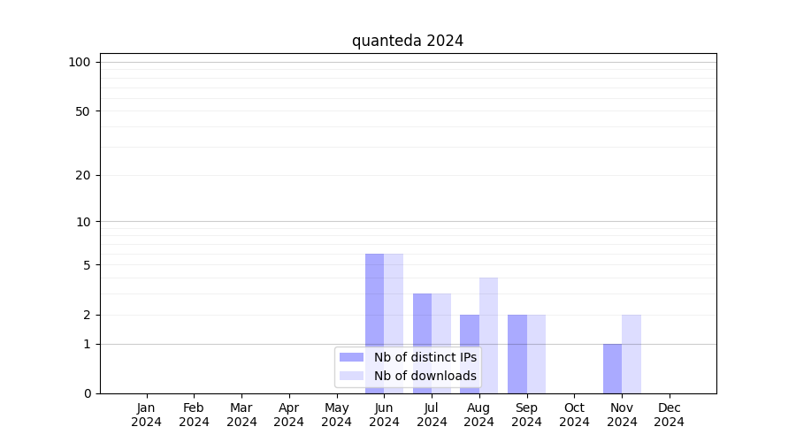 Number of downloads for experiment package quanteda, year by year, from 2025 back to 2014 (years with no downloads are omitted):