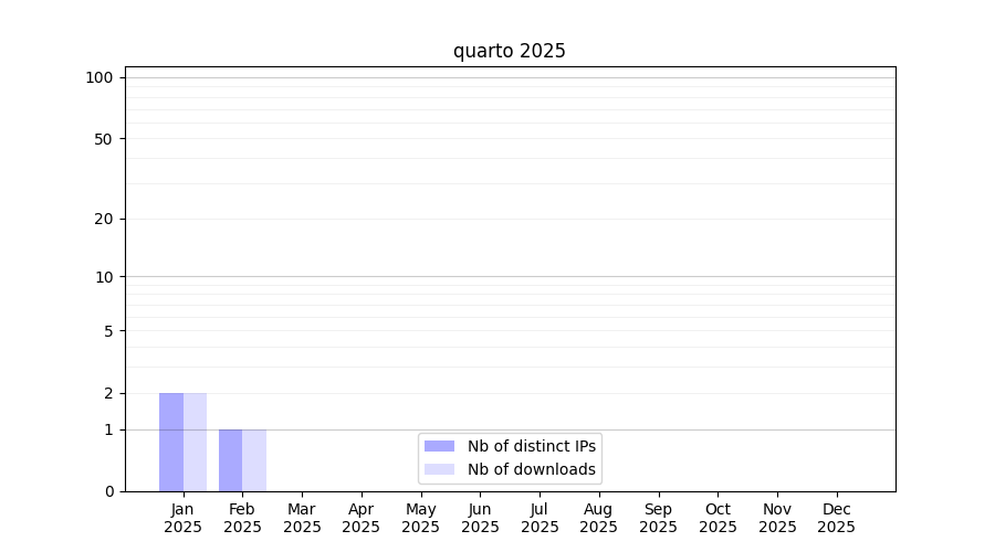 Number of downloads for experiment package quarto, year by year, from 2025 back to 2014 (years with no downloads are omitted):
