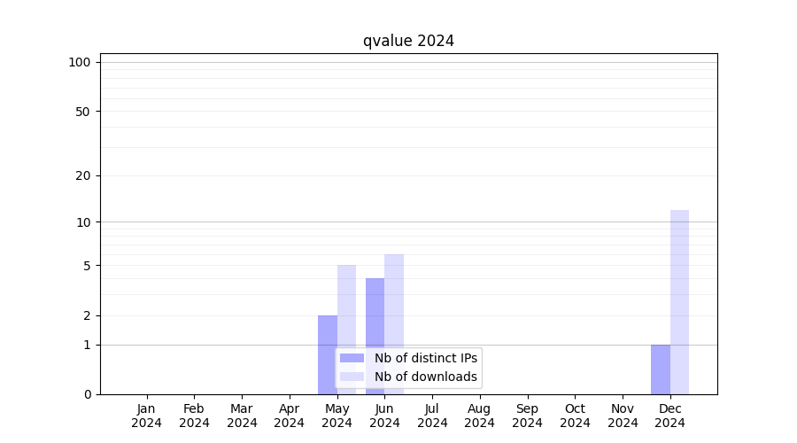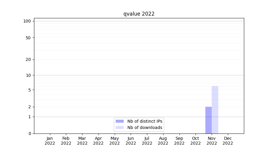 Number of downloads for experiment package qvalue, year by year, from 2025 back to 2014 (years with no downloads are omitted):