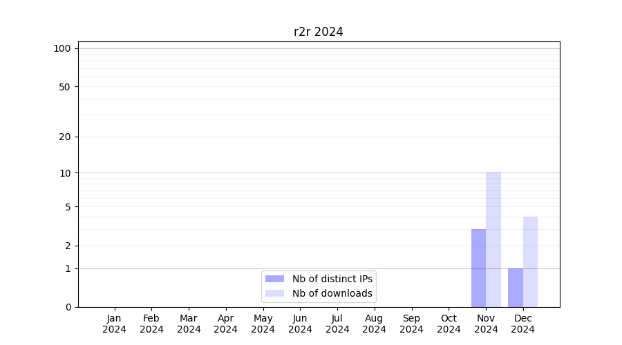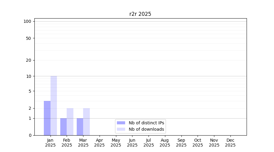 Number of downloads for experiment package r2r, year by year, from 2025 back to 2014 (years with no downloads are omitted):