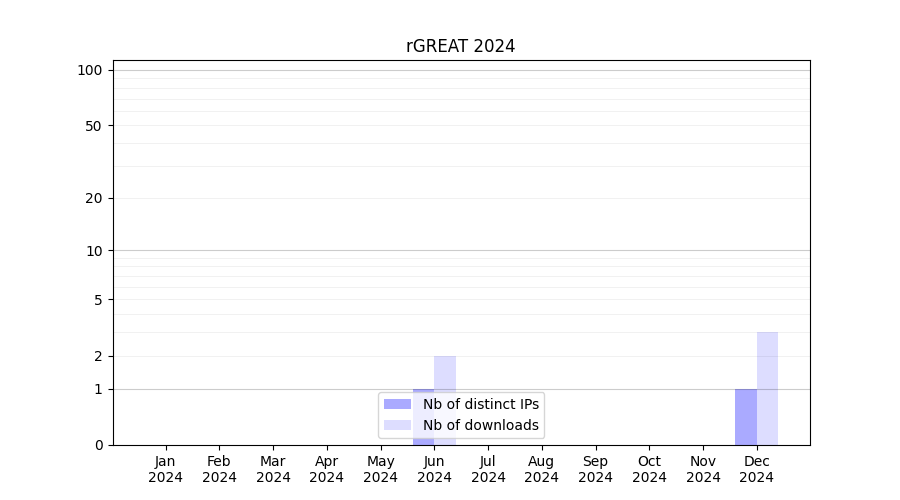 Number of downloads for experiment package rGREAT, year by year, from 2025 back to 2014 (years with no downloads are omitted):