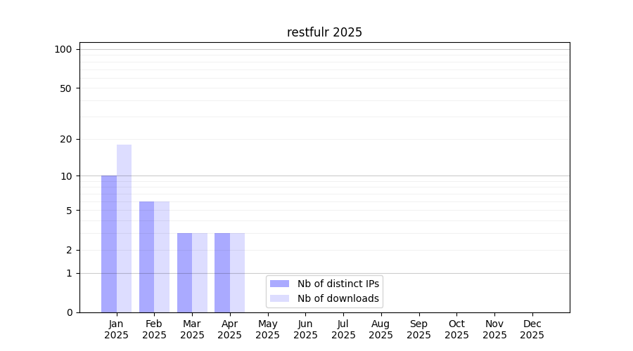 Number of downloads for experiment package restfulr, year by year, from 2025 back to 2014 (years with no downloads are omitted):