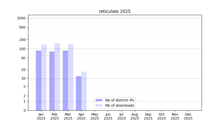 Number of downloads for experiment package reticulate, year by year, from 2025 back to 2014 (years with no downloads are omitted):