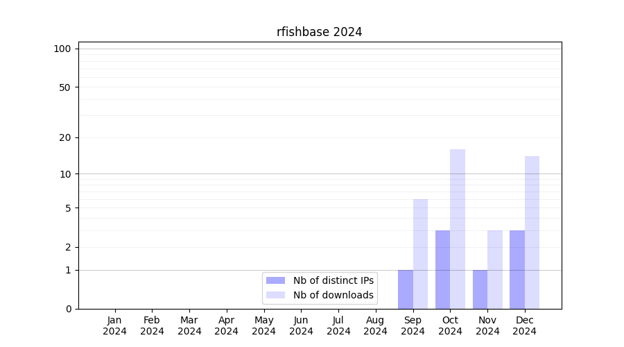 Number of downloads for experiment package rfishbase, year by year, from 2025 back to 2014 (years with no downloads are omitted):