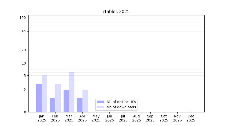 Number of downloads for experiment package rtables, year by year, from 2025 back to 2014 (years with no downloads are omitted):