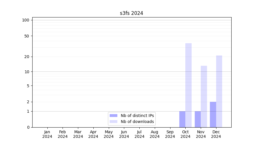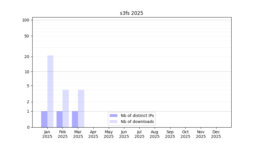Number of downloads for experiment package s3fs, year by year, from 2025 back to 2014 (years with no downloads are omitted):