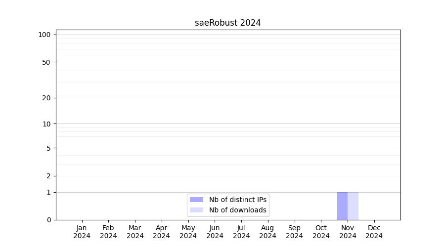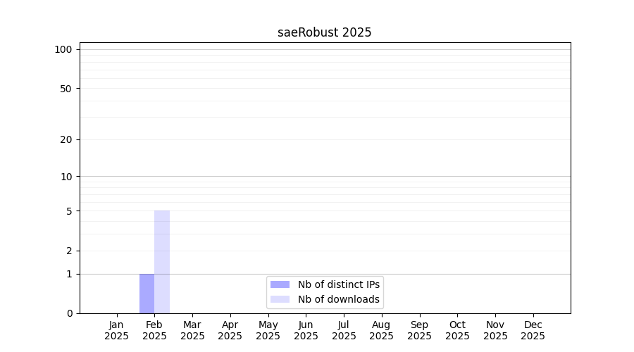 Number of downloads for experiment package saeRobust, year by year, from 2025 back to 2014 (years with no downloads are omitted):