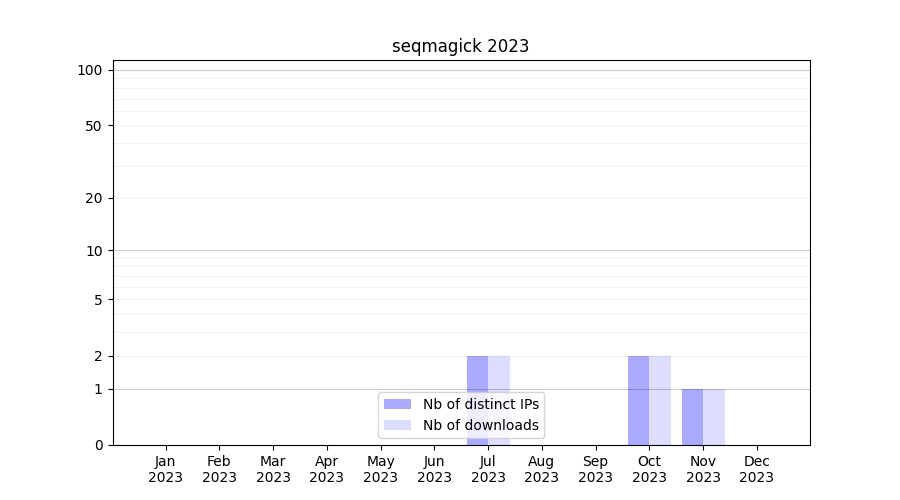 Number of downloads for experiment package seqmagick, year by year, from 2025 back to 2014 (years with no downloads are omitted):