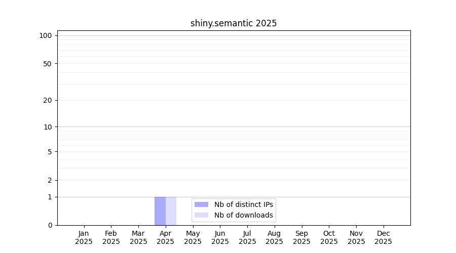 Number of downloads for experiment package shiny.semantic, year by year, from 2025 back to 2014 (years with no downloads are omitted):
