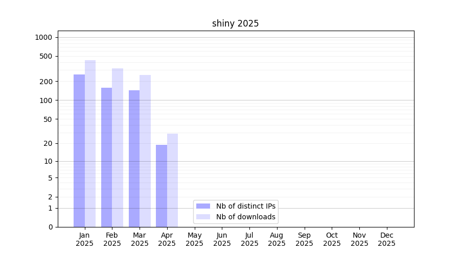 Number of downloads for experiment package shiny, year by year, from 2025 back to 2014 (years with no downloads are omitted):