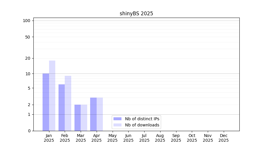 Number of downloads for experiment package shinyBS, year by year, from 2025 back to 2014 (years with no downloads are omitted):