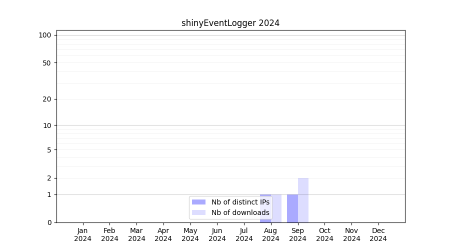 Number of downloads for experiment package shinyEventLogger, year by year, from 2025 back to 2014 (years with no downloads are omitted):