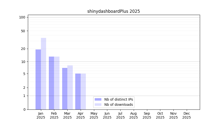 Number of downloads for experiment package shinydashboardPlus, year by year, from 2025 back to 2014 (years with no downloads are omitted):