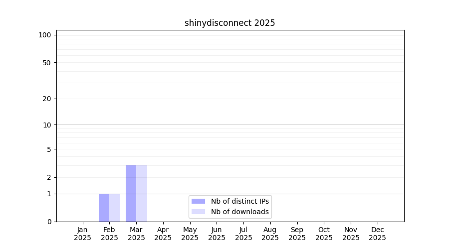 Number of downloads for experiment package shinydisconnect, year by year, from 2025 back to 2014 (years with no downloads are omitted):