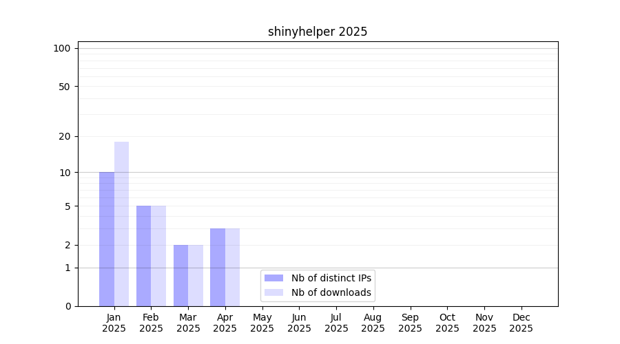 Number of downloads for experiment package shinyhelper, year by year, from 2025 back to 2014 (years with no downloads are omitted):