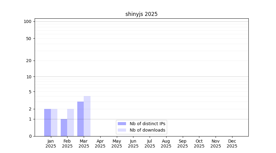Number of downloads for experiment package shinyjs, year by year, from 2025 back to 2014 (years with no downloads are omitted):
