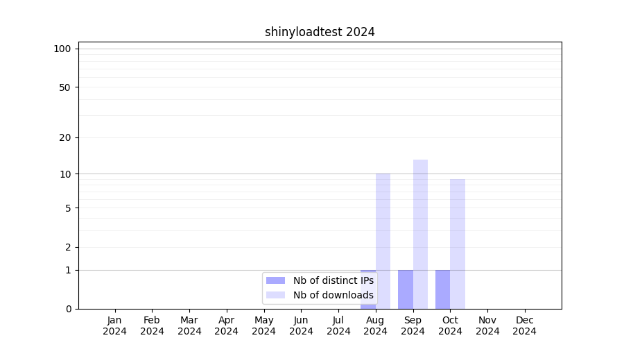 Number of downloads for experiment package shinyloadtest, year by year, from 2025 back to 2014 (years with no downloads are omitted):