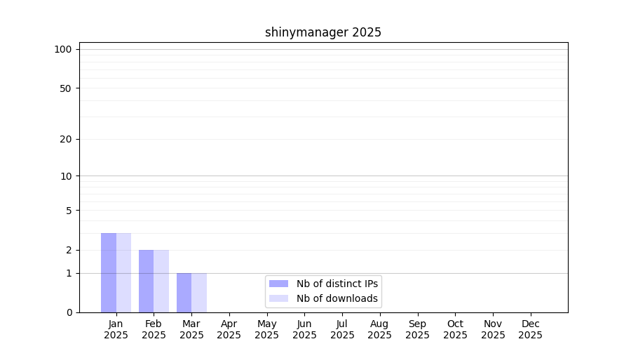 Number of downloads for experiment package shinymanager, year by year, from 2025 back to 2014 (years with no downloads are omitted):