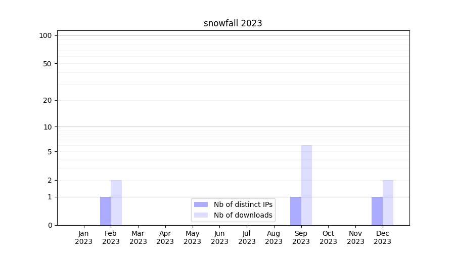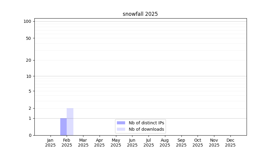Number of downloads for experiment package snowfall, year by year, from 2025 back to 2014 (years with no downloads are omitted):