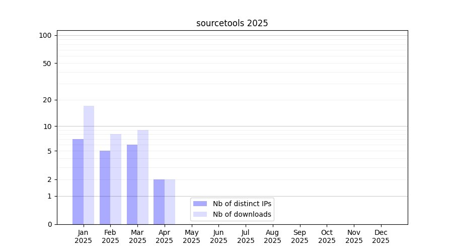 Number of downloads for experiment package sourcetools, year by year, from 2025 back to 2014 (years with no downloads are omitted):