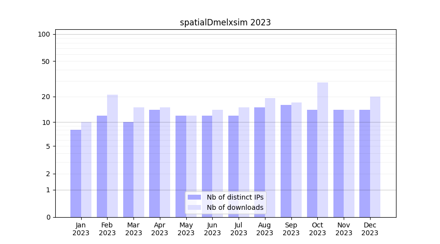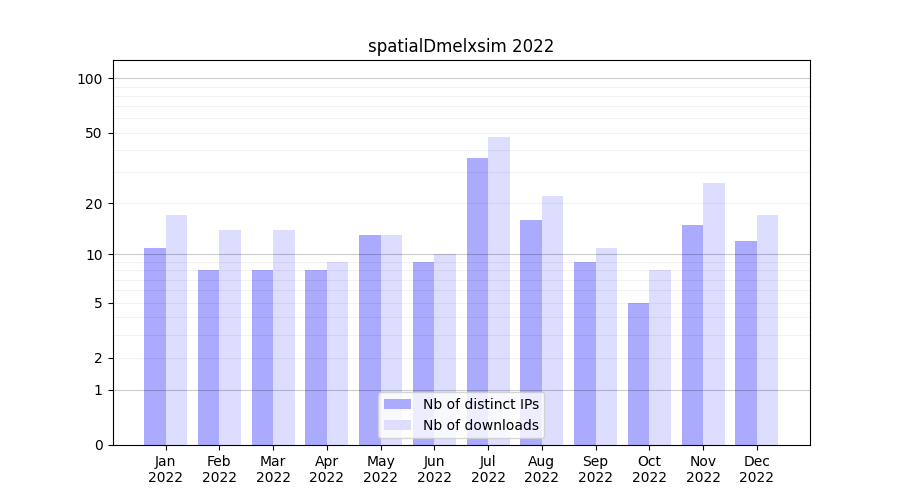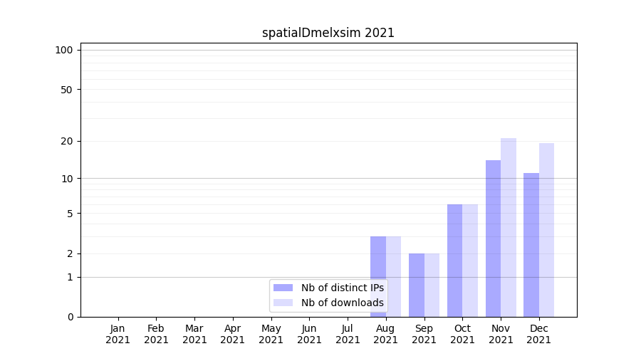 Number of downloads for experiment package spatialDmelxsim, year by year, from 2025 back to 2014 (years with no downloads are omitted):
