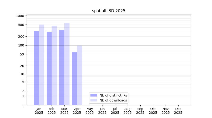 Number of downloads for experiment package spatialLIBD, year by year, from 2025 back to 2014 (years with no downloads are omitted):