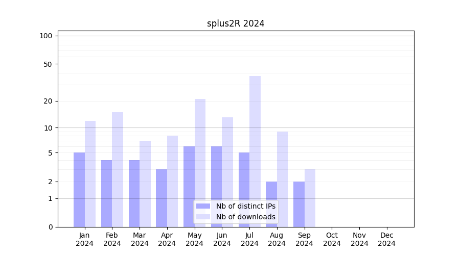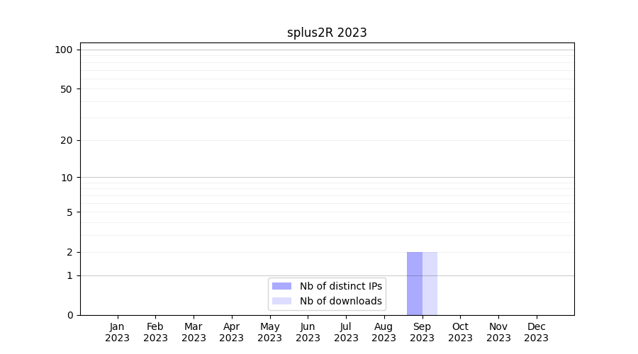 Number of downloads for experiment package splus2R, year by year, from 2025 back to 2014 (years with no downloads are omitted):