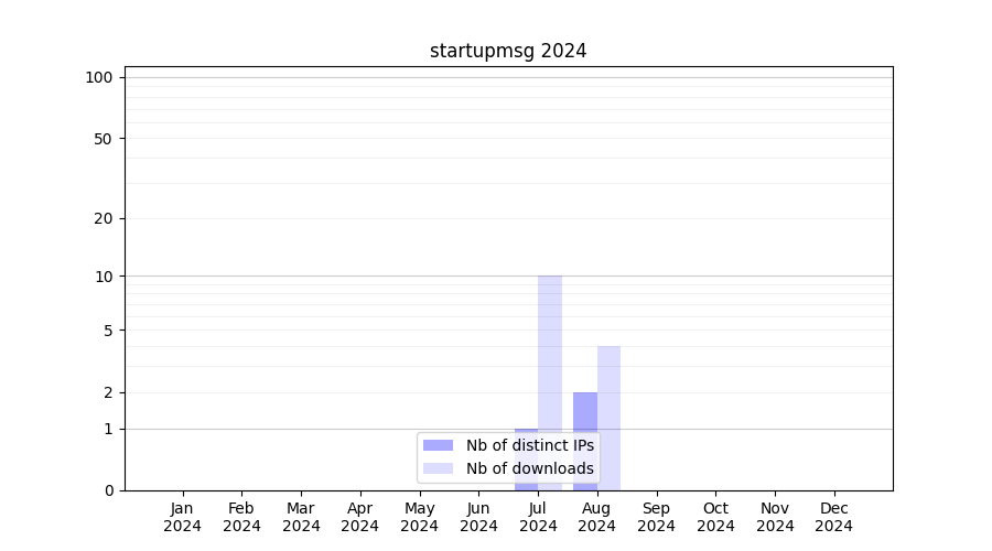 Number of downloads for experiment package startupmsg, year by year, from 2025 back to 2014 (years with no downloads are omitted):