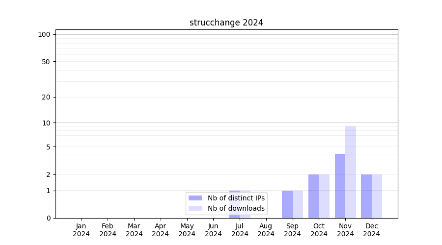 Number of downloads for experiment package strucchange, year by year, from 2025 back to 2014 (years with no downloads are omitted):