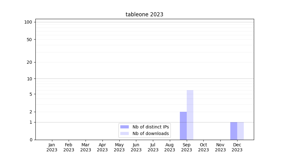 Number of downloads for experiment package tableone, year by year, from 2025 back to 2014 (years with no downloads are omitted):