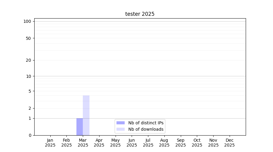 Number of downloads for experiment package tester, year by year, from 2025 back to 2014 (years with no downloads are omitted):