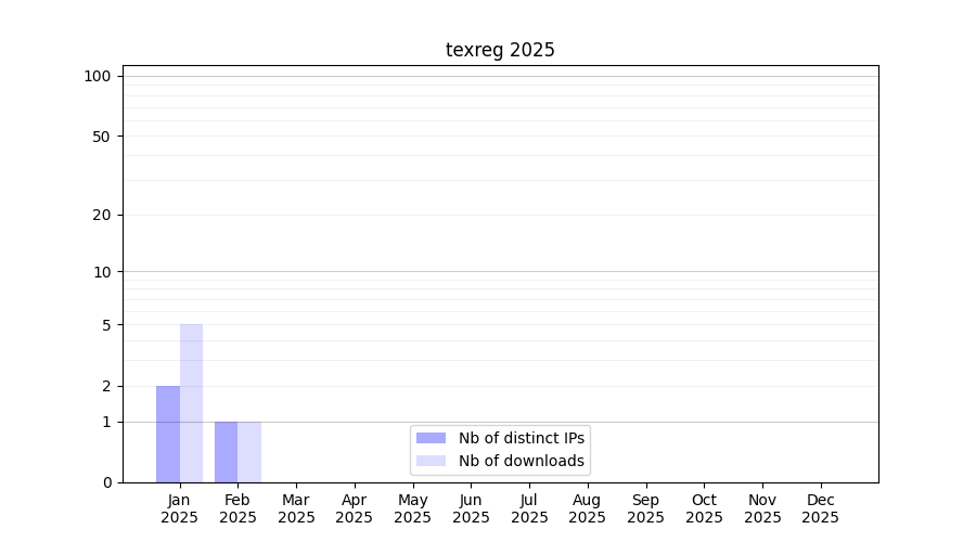 Number of downloads for experiment package texreg, year by year, from 2025 back to 2014 (years with no downloads are omitted):