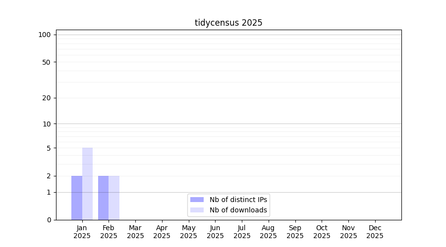 Number of downloads for experiment package tidycensus, year by year, from 2025 back to 2014 (years with no downloads are omitted):