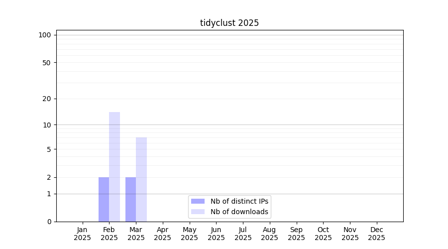 Number of downloads for experiment package tidyclust, year by year, from 2025 back to 2014 (years with no downloads are omitted):