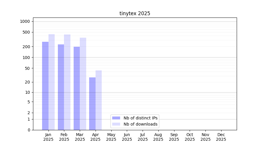 Number of downloads for experiment package tinytex, year by year, from 2025 back to 2014 (years with no downloads are omitted):
