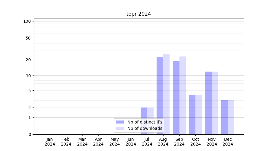 Number of downloads for experiment package topr, year by year, from 2025 back to 2014 (years with no downloads are omitted):
