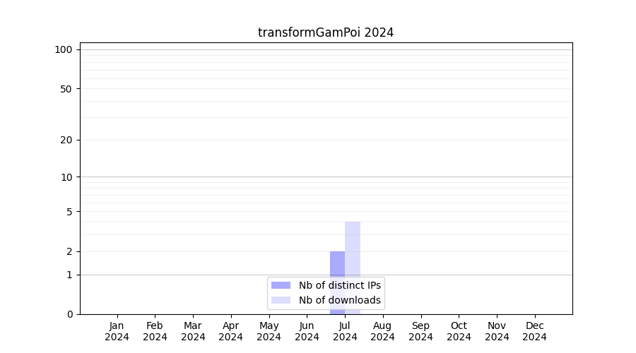 Number of downloads for experiment package transformGamPoi, year by year, from 2025 back to 2014 (years with no downloads are omitted):